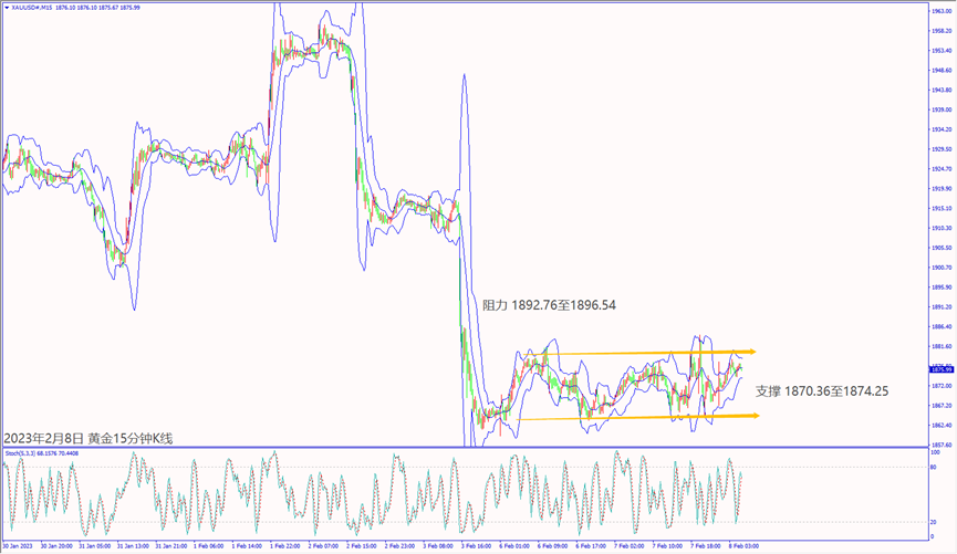 日级别线图,连续上涨守住1870.00关口,KD出现金叉,可能上看30日均线;15分钟K线,短线区间震荡,一旦突破盘整顶部,有机会挑战前高阻力。
