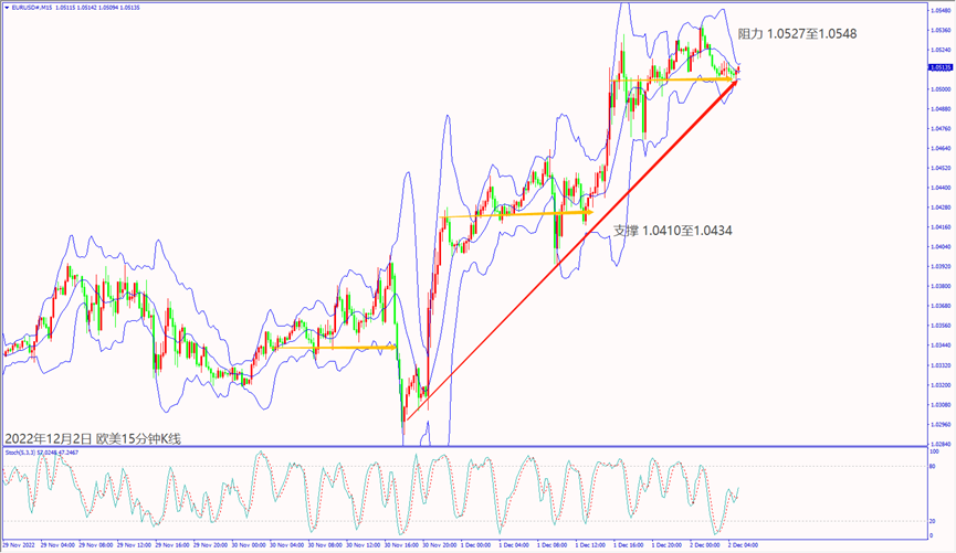 日级别线图,连续上涨创5个月新高,KD多方过热,可能出现回调;15分钟K线,圆形顶反转,一旦跌破上升趋势线,大有可能下探支撑。