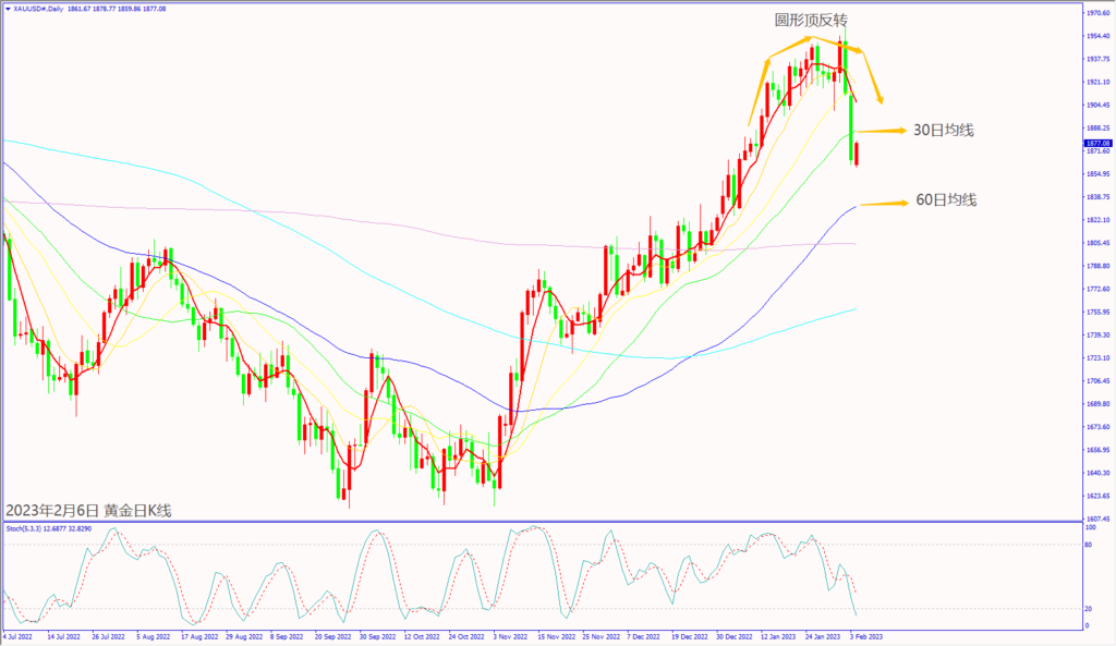 上週二(31日)歐元區公佈去年第四季度GDP利好歐元,以及上週三(1日)美國公佈小非農資料不佳造成美元指數擴大下跌,帶動黃金價格上漲約55美元。上週四(2日)英國和歐洲央行皆宣佈加息50個點,並且行長拉加德對未來經濟增長示警利淡歐元和利好美元指數反彈,以及上週五(3日)美國公佈非農資料利好美元指數暴漲,造成黃金價格反轉崩跌近百美元,尾盤守在1860.00關口上方整理。