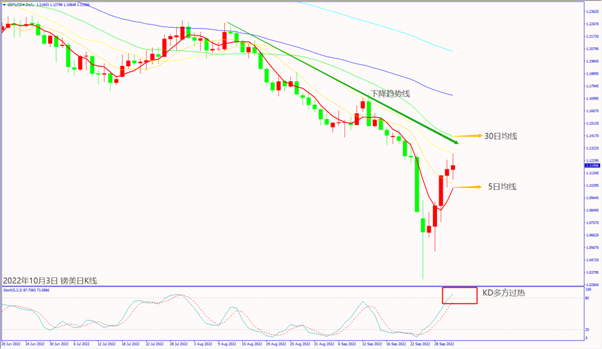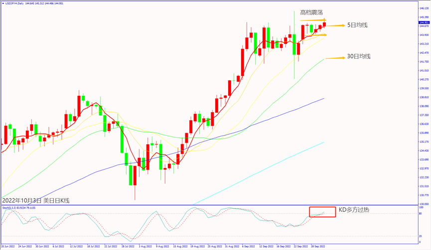 日級別線圖,連續上漲KD多方過熱,一旦跌破5日均線,可能回測30日均線。