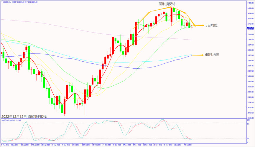 日級別線圖,圓形頂反轉, 5日均線沖不過,可能延續下跌走勢。