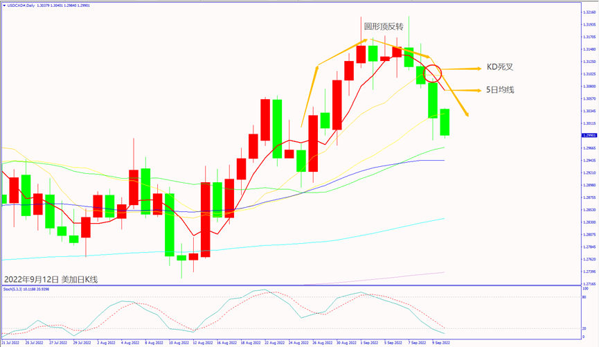 日級別線圖,圓形頂反轉,KD出現死叉,可能延續跌勢。