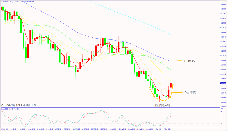 日級別線圖,圓形底反轉,5日均線上彎,可能挑戰60日均線。