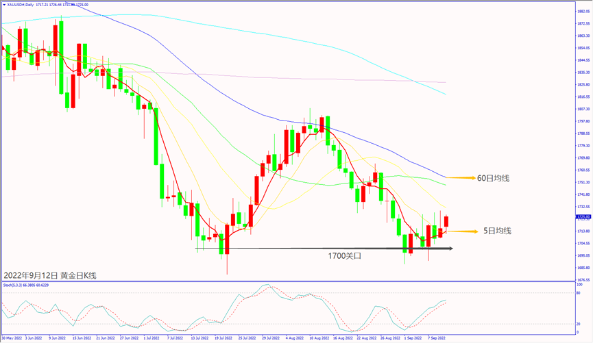 日級別線圖,近期在1700關口附近震盪,守住5日均線,有望挑戰60日均線。
