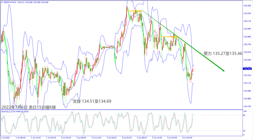 日級別線圖,出現避雷針反轉,一旦跌破135.00關口,可能轉跌;15分鐘K線,短線形成盤跌,下降趨勢線反壓,大有可能回測前低支撐。