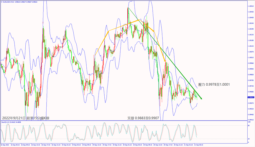 日級別線圖,長黑K吞噬前兩天漲勢,5日均線沖不過,可能下看新低;15分鐘K線,頭肩頂反轉,頸線反壓,大有可能回測前低支撐。