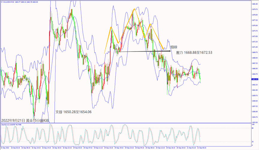 昨天(20日)受到美元指數大漲影響,造成黃金價格跌至1665美元附近整理。預期今天(21日)市場預期美聯儲利率決議宣布加息利好美元上漲,黃金價格一旦跌破小時布林帶下軌線1661美元,建議可短空操作。