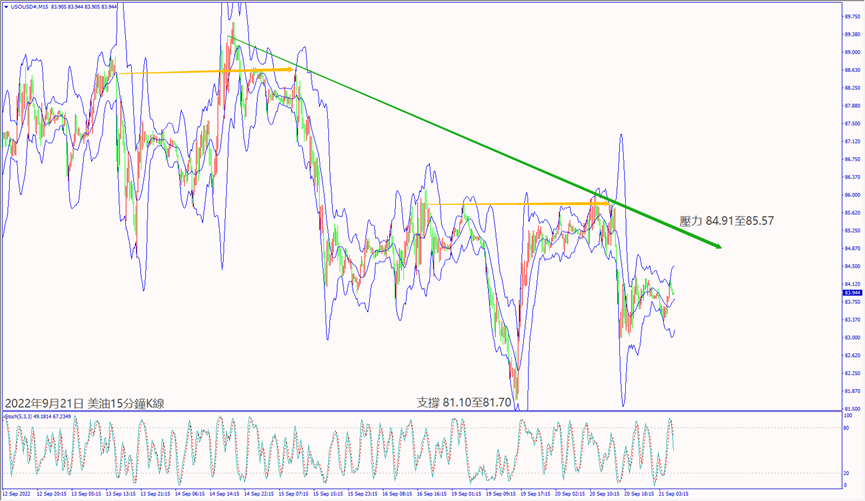 昨天(20日)歐洲央行官員預期維持加息抑制通脹,以及市場預期本週四(22日)美聯儲利率決議宣布加息75個基點,造成歐美股指皆跌逾2%。美國白宮經濟顧問對就業市場表示樂觀,道瓊斯和納指尾盤逆勢拉升超百點。美國傳染病研究所所長福奇表示防疫未達預期標準,並且每天死於新冠人數仍數百人,市場擔憂需求下降造成美油價格下跌約3%。美國國家安全顧問表示支持烏克蘭對抗俄羅斯,市場避險資金推升美油價格漲至84美元附近整理。