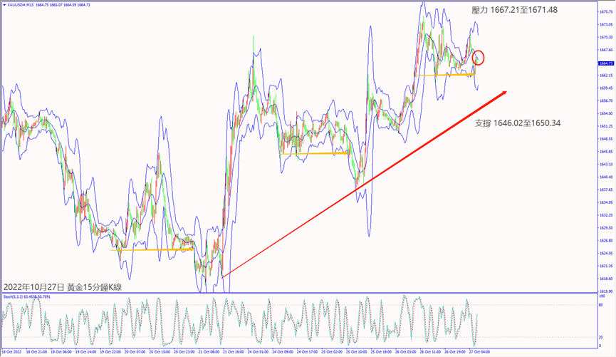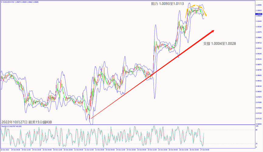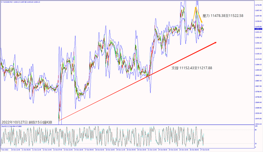 昨天(26日)美元指數擴大下跌,引發市場預期美聯儲加息趨緩,帶動道瓊斯和納指漲近2%。美國企業財報不佳,造成道瓊斯和納指轉跌超300點。預期今天(27日)歐洲央行利率決議宣布加息75個點,德指一旦跌破小時布林帶下軌線13,094,建議可短空操作。預期今天美國公佈經濟數據大都不佳,納指若摜破5日均線11,437,建議可短空操作。
