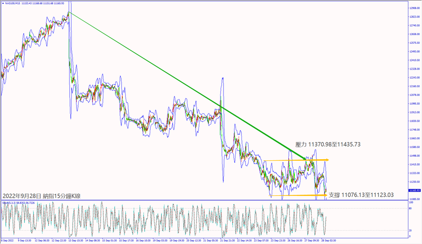 昨天(27日) 北溪管道洩漏事件恐造成歐洲通脹上升,以及美聯儲多位官員預期將加息更多,造成歐美股指皆大跌超3%。預期今天(28日)歐洲央行行長拉加德對地緣政治問題將造成歐洲下半年經濟衰退,德指沖不過小時布林帶中軌12,026,建議可偏空操作。預期今天美聯儲主席鮑威爾重申加息抑制通脹不會造成經濟衰退利,納指一旦突破小時布林帶中軌11,254,建議可短多操作。