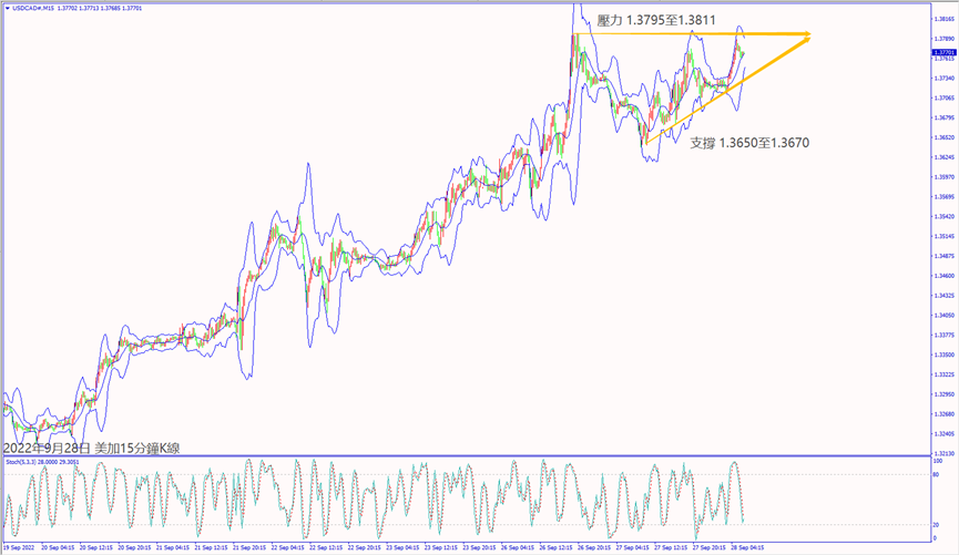 昨天(27日)因烏克蘭4個地區通過加入俄羅斯公投,造成俄烏擴大衝突一度帶動美油價格漲逾4%,受到歐美股指大跌影響,美油價格尾盤回落至78.50美元附近震盪。預期今天(28日)美國公佈EIA原油庫存高於市場預期,美油價格沖不過小時布林帶中軌77.88美元,建議可短空操作。