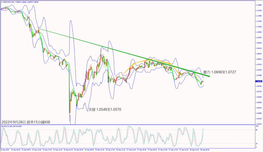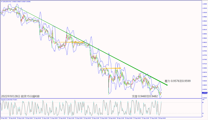 昨天(27日)前白宮經濟顧問表示美國經濟面臨衰退風險,亞洲市場拋售美元造成指數下跌約90個點,拖累美日和美加皆跌逾70個點,推升歐美和鎊美分別上漲85和185個點。北溪管道洩漏事件恐造成歐洲通脹上升利淡歐元,以及晚間美國公佈製造業數據利好和美聯儲布拉德表示會出現更多的加息,利好美元指數逆勢上漲約115個點,帶動美日和美加反轉上漲收復當日跌勢,也讓歐美、鎊美、澳美和紐美反轉下跌逾百點。