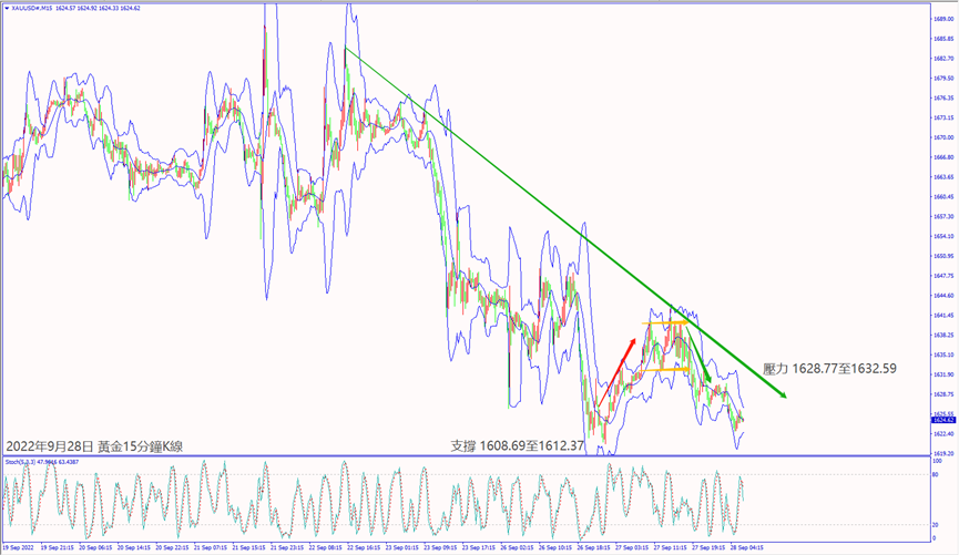 昨天(27日)多位美聯儲官員預期將加息更多利好美元大漲,也讓黃金價格反轉下跌,尾盤守在1630美元附近整理。預期今天美聯儲主席鮑威爾重申加息抑制通脹不會造成經濟衰退利好美元,黃金價格一旦跌破小時布林帶下軌線1621美元,建議可偏空操作。