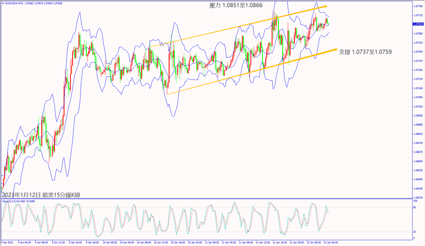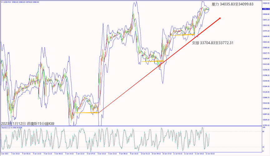 昨天(11日)歐洲央行官員預期2023年通脹下降,以及市場預期本週四(12日)美國公佈CPI數據續跌,帶動歐美股指皆漲逾1%。預期今天美國公佈CPI如市場預期,可能造成道瓊斯出現獲利賣壓,一旦跌破小時布林帶中軌33,922,建議可短空操作。預期今天美聯儲哈克對美國經濟前景表示樂觀,納指若守住60日均線11,367,建議可短多操作。