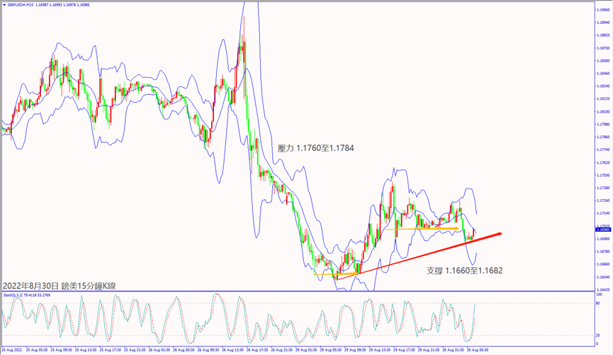 日級別線圖,金針探底反轉信號,一旦突破1.1700關口,有望出現反彈;15分鐘K線,短線形成盤漲,布林帶中軌若刺破,不排除挑戰起跌壓力。