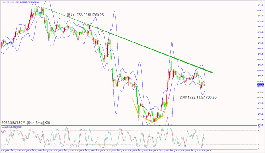 日級別線圖,十字線反轉信號,一旦突破5日均線,有望挑戰1760美元;15分鐘K線,圓弧底反轉,下降趨勢線若突破,大有可能挑戰前高壓力。