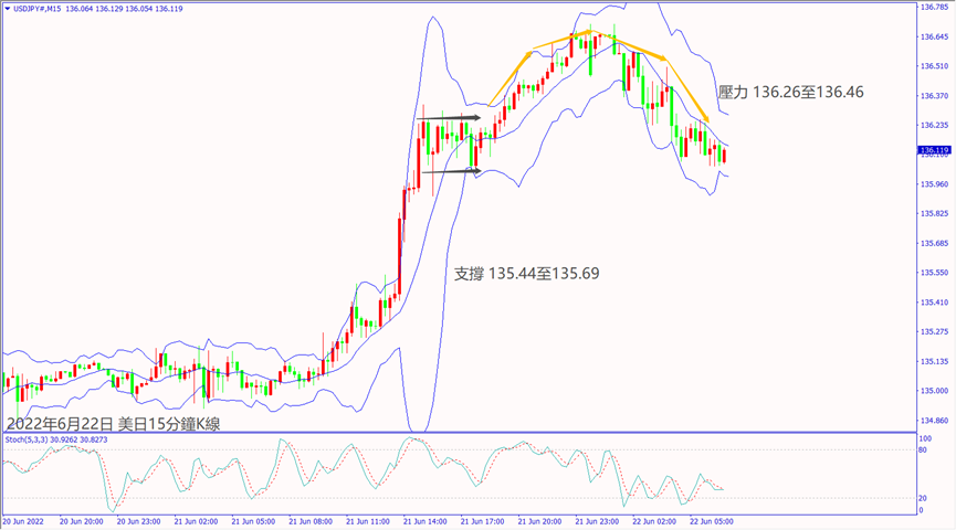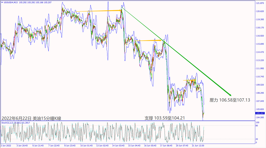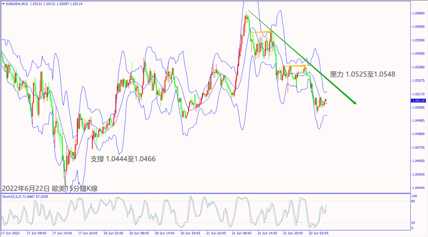 昨天(21日)英國央行經濟學家預測貨幣緊縮將需要12-18個月才能抑制通脹,加上歐洲央行官員稱預期9月加息50個基點極為可能,帶動歐美和鎊美皆漲逾60個點,也讓美元指數下跌約50個點,拖累美加下跌約80個點。晚間德國總理和財長對通脹影響經濟示警,也讓歐美和鎊美反轉下跌。美聯儲巴爾金對6月加息3碼或將在7月加息2~3碼樂觀抑制通脹,帶動美元指數反轉大漲約60個點,以及日本央行行長黑田東彥表示維持寬鬆貨幣,利好美日再度飚漲約180個點,也讓歐美、鎊美和紐美下跌超45個點。