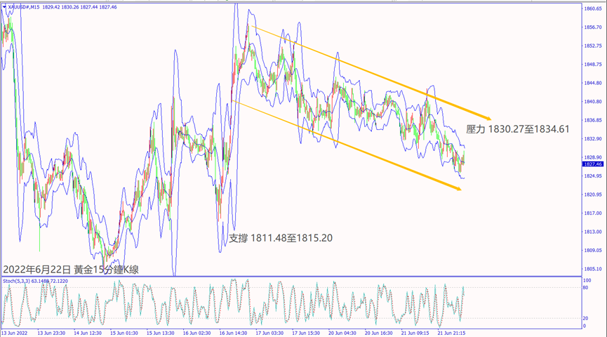 日級別線圖,紡錘線黑K跌破240日均線,1830關口反壓,可能回測1810美元;15分鐘K線,短線出現下降楔形,沖不過趨勢線,大有可能下探支撐。