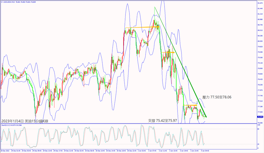 昨天(3日)美股反轉下跌逾2%,拖累美油價格轉跌近6%,尾盤守在77.00關口附近整理。預期今天(4日)歐美公佈經濟數據不佳利淡股指,美油價格沖不過小時布林帶上軌線77.78美元,建議可短空操作。