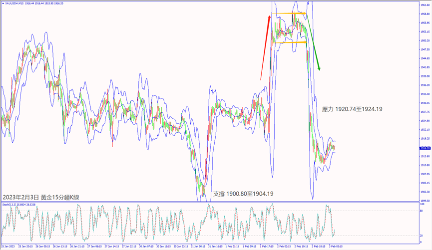 日級別線圖,長黑K吞噬前兩天漲勢,5日均線沖不過,可能持續下跌;15分鐘K線,箱型反轉,一旦跌破布林帶下軌線,不排除回測下方支撐。