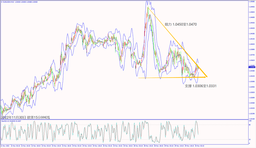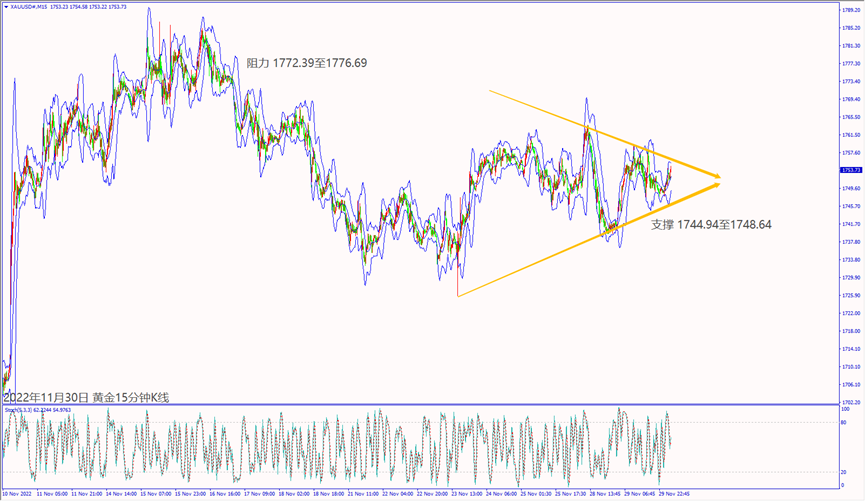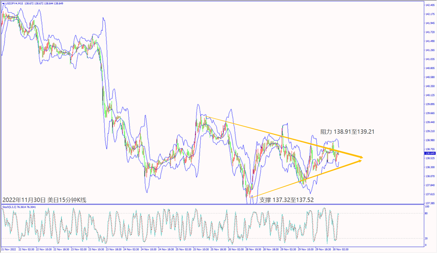 日级别线图,近期在139.00关口附近震荡,5日均线冲不过,可能重回跌势;15分钟K线,出现对称三角形整理,一旦跌破布林带下轨线,大有可能下探支撑。