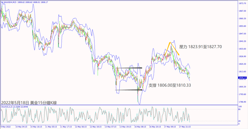 週二(17日)受到美元指數大跌影響,黃金價格從早上低點上漲約15美元。晚間美聯儲布拉德和主席鮑威爾表示加息抑制通脹,造成黃金價格回落至1810關口上方整理。