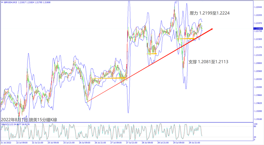 日級別線圖,十字線反轉信號, 1.2200關口沖不過,可能回測10日均線;15分鐘K線,短線形成盤漲,上升趨勢線若摜破,大有可能下探支撐。