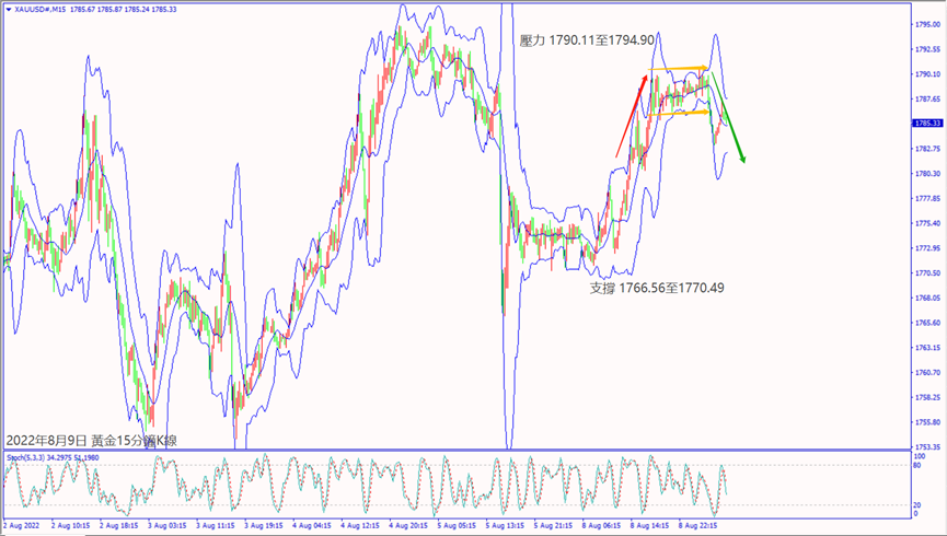 日級別線圖,近三天在1790關口下方震盪,60日均線沖不過,可能回測10日均線;15分鐘K線,出現箱型反轉,前波盤整蓋頂,大有可能下探支撐。