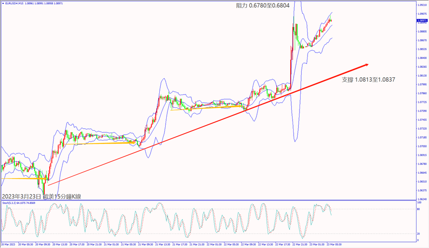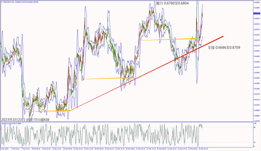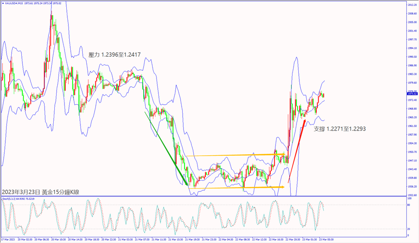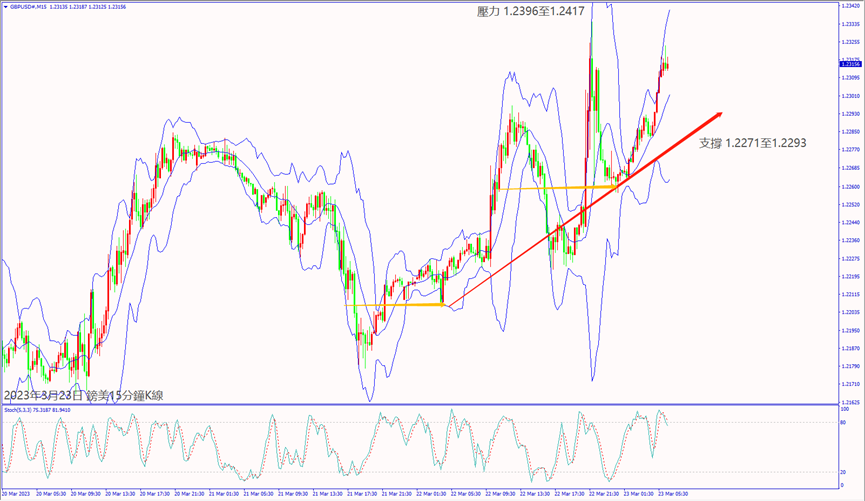 昨天(22日)週三(22日)德國央行和歐洲央行行長均重申繼續加息利好歐美和鎊美上漲,利淡美元指數下跌。英國公佈CPI數據攀升但工業訂單差值不佳,造成鎊美出現70個點震盪。週四(23日)清晨美聯儲利率決議宣布加息1碼如市場預期,但是下調今明兩年GDP增長,利淡美元指數擴大下跌約125個點,拖累美日和美加皆跌超90個點,利好歐美、鎊美、澳美和紐美皆漲逾百點。美聯儲主席鮑威爾對維持加息和經濟增長表示樂觀,美元指數止跌反彈,利好美加收復跌勢,也讓澳美和紐美吞噬漲勢。