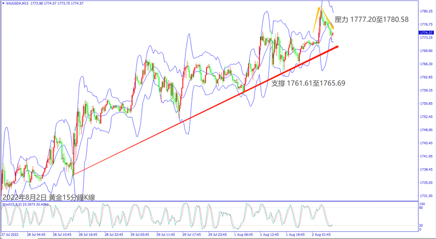 昨天(1日)美國經濟數據好壞參半,但是猴痘疫情攀升造成美元指數創三週新低,市場買盤帶動黃金價格上漲約15美元,尾盤守在1770關口附近整理。穆迪預測美聯儲在年底前將上調利率基準,預期今天(2日)美元指數出現反彈,黃金價格若跌破小時布林帶中軌1773,建議可短空操作。