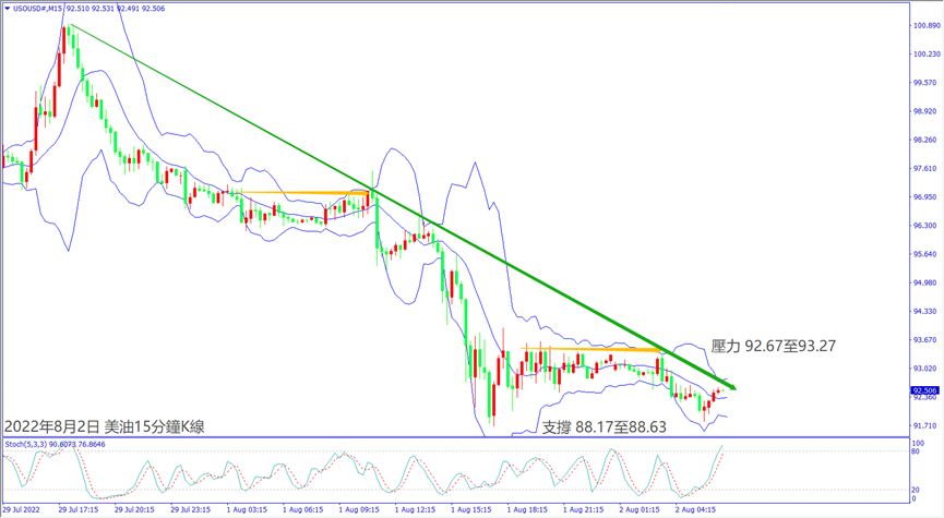昨天(1日)歐美公佈經濟數據好壞參半,美油價格反轉大跌近6%,尾盤守在93.00關口整理。預期今天(2日)市場傳出歐佩克+部長會議提出增產計劃,美油價格若跌破小時布林帶下軌線92.17,建議可短空操作。