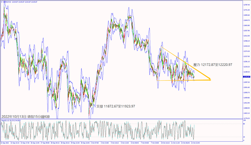 昨天(12日)美國公佈PPI數據持續攀升,一度造成道瓊斯和納指下跌約200點,週四(13日)清晨美聯儲會議紀要表示校準緊縮政策,道瓊斯和納指止跌反彈。預期今天德國公佈CPI數據攀升利好加息,德指一旦跌破小時布林帶下軌線12,122,建議可短空操作。預期今天美國公佈CPI數據下降利淡加息,道瓊斯若突破5日均線29,272,建議可短多操作。