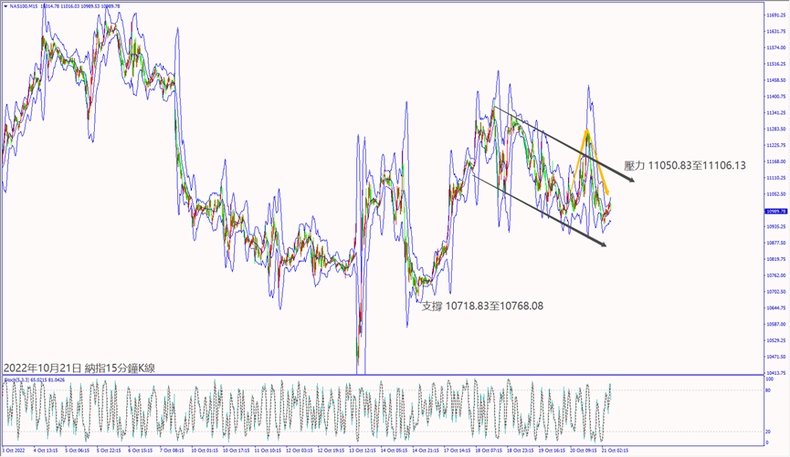 昨天(20日)英國首相特拉斯宣布辭職,利淡歐美股指轉跌約2%吞噬當日漲勢。預期今天(21日)英國公佈零售銷售數據不佳,德指沖不過小時布林帶中軌12,663,建議可短空操作。預期今天歐盟領導人會議樂觀加息抑制通脹利淡歐美股指,納指一旦跌破10日均線10,979,建議可短空操作。