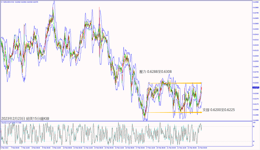 日級別線圖,近期在0.6200關口上方盤底,一旦突破5日均線,可能啟動漲勢;15分鐘K線,短線處於區間震盪,盤整頂部若突破,有機會挑戰起跌壓力。