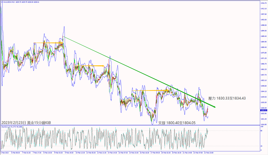 今天(23日)清晨美聯儲貨幣會議紀要重申維持加息利好美元,造成黃金價格反轉下跌約23美元。預期今天(23日)美國公佈第四季度GDP利好美元,黃金價格沖不過小時布林帶上軌線1833美元,建議可短空操作。