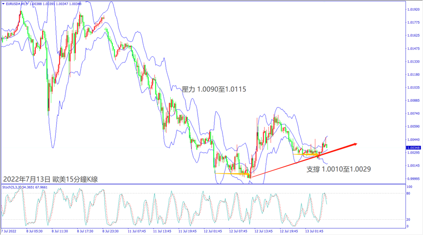 昨天(12日)美元指數衝上108關口再創20年新高,亞洲市場買盤推升續漲,也讓歐美和鎊美從早上高點持續下跌逾55個點。歐洲央行官員重申7月加息,以及美國公佈經濟數據不佳造成美元指數反轉大跌約70個點,拖累美日和美加跌逾70個點,推升歐美和鎊美皆漲超70個點。美國白宮備忘錄預期週三(13日)公佈6月的CPI持續上漲,以及美聯儲巴爾金預期7月利率決議加息50或75個基點,利好美元指數止跌反彈。