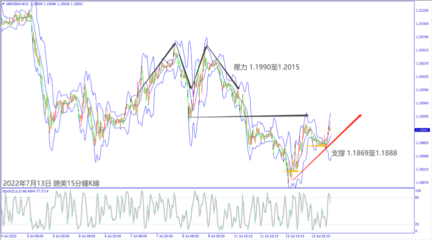 日級別線圖,十字線反轉信號,守住1.1900關口,有望止跌反彈;15分鐘K線,短線形成盤漲,一旦突破前波M頭頸線,大有可能挑戰上方壓力。