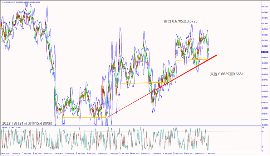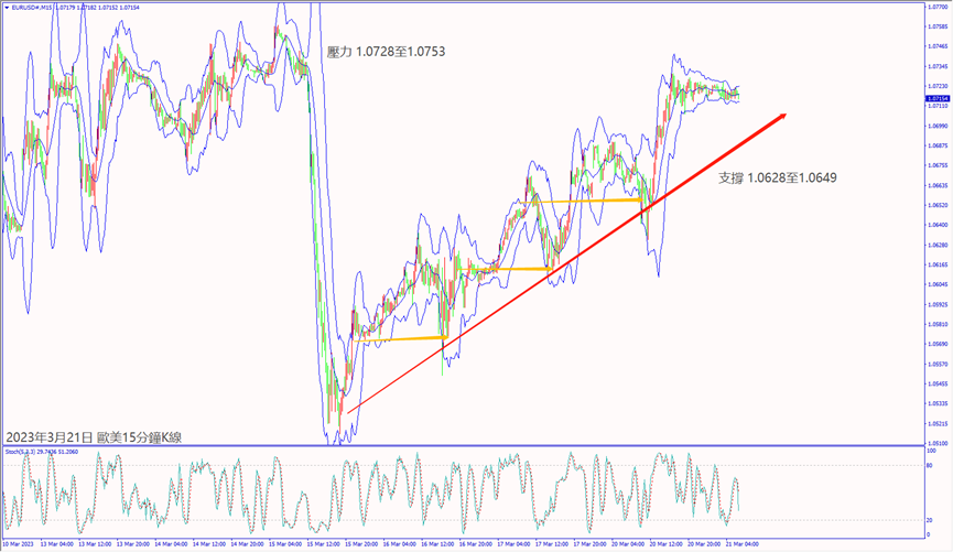 昨天(20日)日本央行會議意見摘要重申降低物價目標利好日元,造成美日從早上高點下跌約210個點。市場擔憂瑞信AT1債券敞口恐衝擊經濟,造成亞洲企業拋售歐元讓歐美下跌約60個點。德國公佈PPI數據高於市場預期,以及歐洲央行官員再度重申加息抑制通脹,利好歐美和鎊美皆漲逾百點,利淡美元指數跌約70個點,拖累美加下跌約95個點。晚間美國官員持續檢討矽谷銀行倒閉事件,美元指數止跌在103.00關口下方整理。