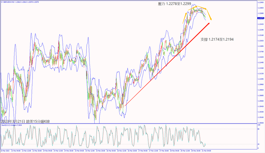 昨天(20日)受到瑞信AT1債券敞口影響,一度造成歐美股指跌近2%。晚間歐美官員對該問題皆表示影響不大,也讓道瓊斯和納指逆勢漲超2%收復跌勢。預期今天(21日)歐元區經濟數據大都不佳,德指沖不過小時布林帶上軌線15,084,建議可短空操作。市場預期本周美聯儲利率決議宣布加息,道瓊斯沖不過小時布林帶上軌線32,342,建議可短空操作。