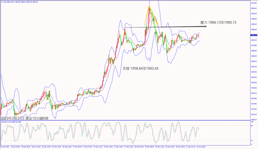 昨天(20日)受到瑞信AT1債券敞口影響,市場避險資金回補黃金後又拋售,造成價格出現40美元震盪,尾盤守在1970.00關口附近盤整。預期美聯儲利率決議前夕今天(21日)市場回補美元,黃金價格若跌破小時布林帶下軌線1970美元,建議可短空操作。