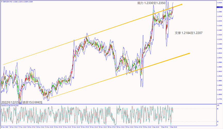 日級別線圖,連續上漲KD多方過熱,一旦摜破240日均線,可能回調整理;15分鐘K線,短線形成盤漲,布林軌道中軌若跌破,可能回測上升趨勢線。