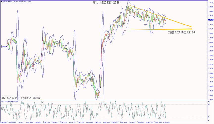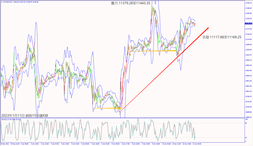 昨天(10日)歐元區公佈經濟數據利好,以及德國經濟顧問對通脹表示可能見頂,利好歐美股指皆漲逾1%。預期今天(11日)歐洲央行官員重申2月加息50個基點,德指一旦跌破小時布林帶中軌14,818,建議可短空操作。市場預期美國CPI下滑利淡加息,納指若守住小時布林帶下軌線11,159,建議可短多操作。