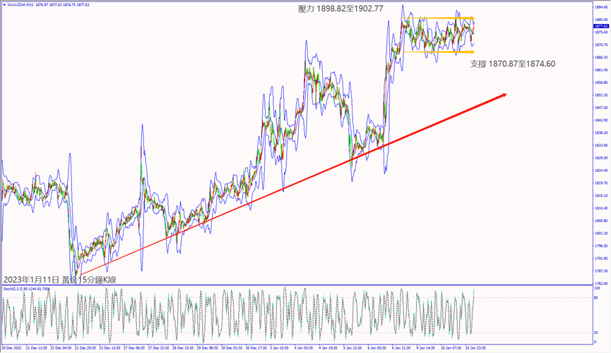 昨天(10日)美元指數出現震盪,但受到美債收益率出現漲勢影響,一度造成黃金價格從當日高點轉跌約10美元,尾盤反彈至1875美元附近整理。預期今天(11日)歐洲央行官員重申2月加息50個基點利好歐元和利淡美元,黃金價格若突破小時布林帶上軌線1880美元,建議可短多操作。
