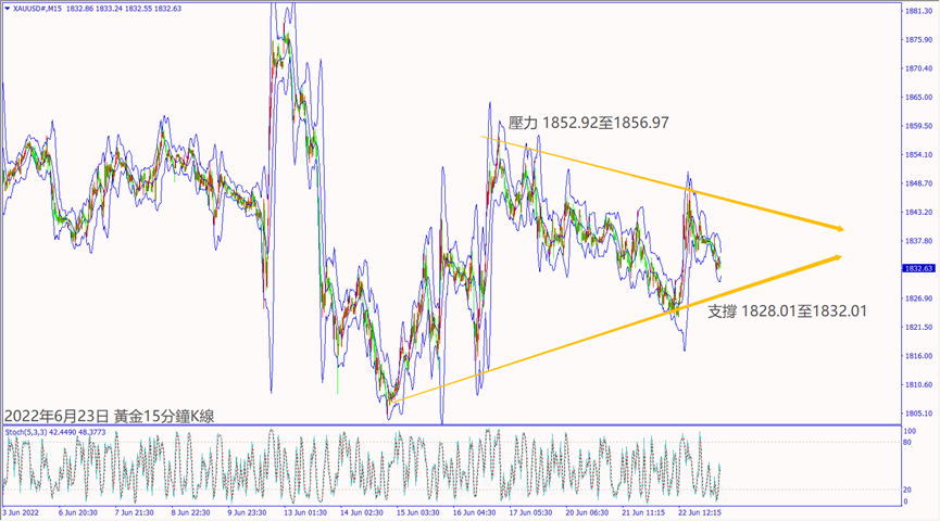 週三(22日)受到美元指數上漲影響,造成黃金價格回落至1825美元附近整理。隨著美聯儲主席鮑威爾預測經濟接近衰退造成美元暴跌,市場買盤回補黃金帶動價格逆勢上漲約25美元。直到美元指數止跌反彈,造成黃金價格回落至1840關口上方整理。