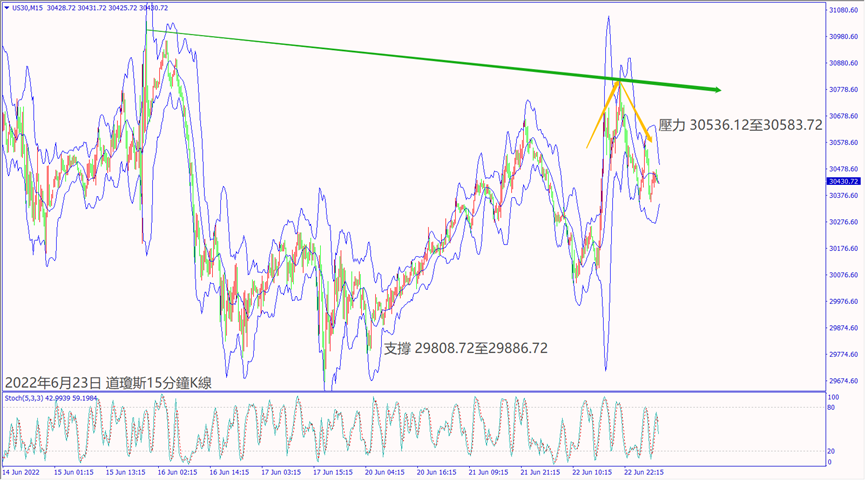 昨天(22日)美聯儲主席鮑威爾對經濟表示強勁增長,一度帶動道瓊斯和納指大漲約2%,但是持續加息或將造成經濟接近衰退,造成道瓊斯和納指吞噬漲勢。預期今天(23日)歐元區公佈經濟數據大都不佳,德指一旦跌破小時布林帶下軌線13,023,建議可短空操作。預期今天美國公佈經濟數據大都不佳,道瓊斯若跌破5日均線30,330,建議可短空操作。