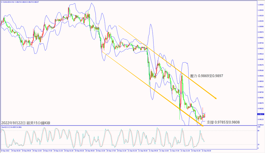 日級別線圖,長黑K再創20年新低,移動均線空方排列,可能延續跌勢;15分鐘K線,出現下降楔形,守住趨勢線,有機會挑戰起跌壓力。