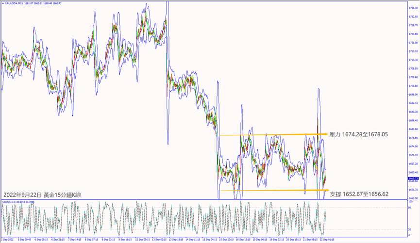今天(22日)清晨美聯儲利率決議宣布加息,點陣圖預測今年至少再加息3碼造成美元指數震盪,黃金價格一度急漲35美元,尾盤回落在1670美元上方整理。預期今天瑞士和英國央行利率決議宣布加息利好歐元和利淡美元,黃金價格若突破小時布林帶上軌線1662美元,建議可短多操作。