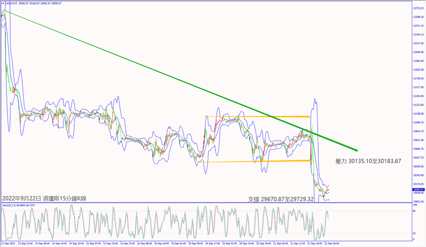 今天(22日)清晨美聯儲利率決議宣布加息,點陣圖預測今年至少再加息3碼,造成歐美股指反轉大跌逾2%。預期今天瑞士和英國央行利率決議宣布加息,德指沖不過小時布林帶中軌12,563,建議可偏空操作。預期今天美國公佈經濟數據好壞參半,道瓊斯沖不過小時布林帶中軌30,194,建議可偏空操作。