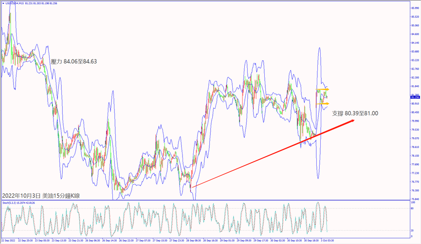 日級別線圖,紡錘線黑K吞噬上週三一半漲勢,5日均線上彎,可能延續上漲;15分鐘K線,早盤跳空高開,守住81美元進行盤整,有機會挑戰上方壓力。