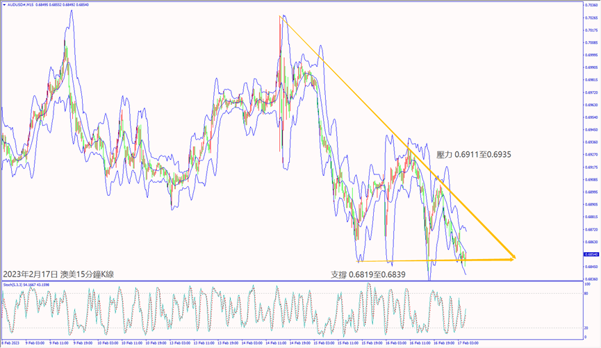 日級別線圖,連續下跌空方背離,守住60日均線,可能出現反彈;15分鐘K線,下降三角形整理,若守穩盤整底部,有機會挑戰起跌壓力。